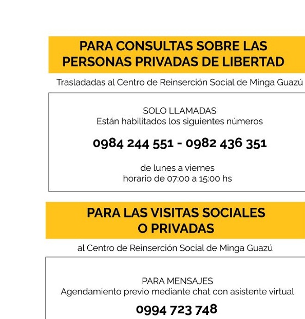 Para consultas sobre las personas privadas de libertad que fueron trasladadas a Minga Guazú, están habilitados los siguientes números 0984-244551 y 0982-436351, de lunes a viernes en el horario de 07:00 a 15:00 hs.